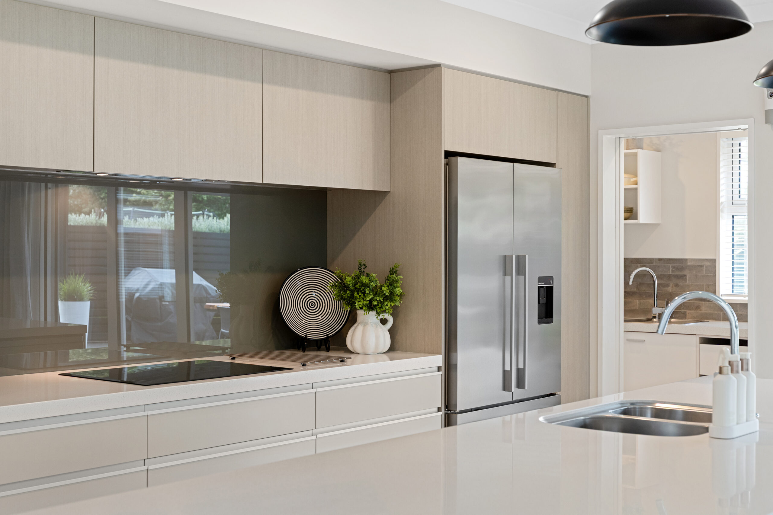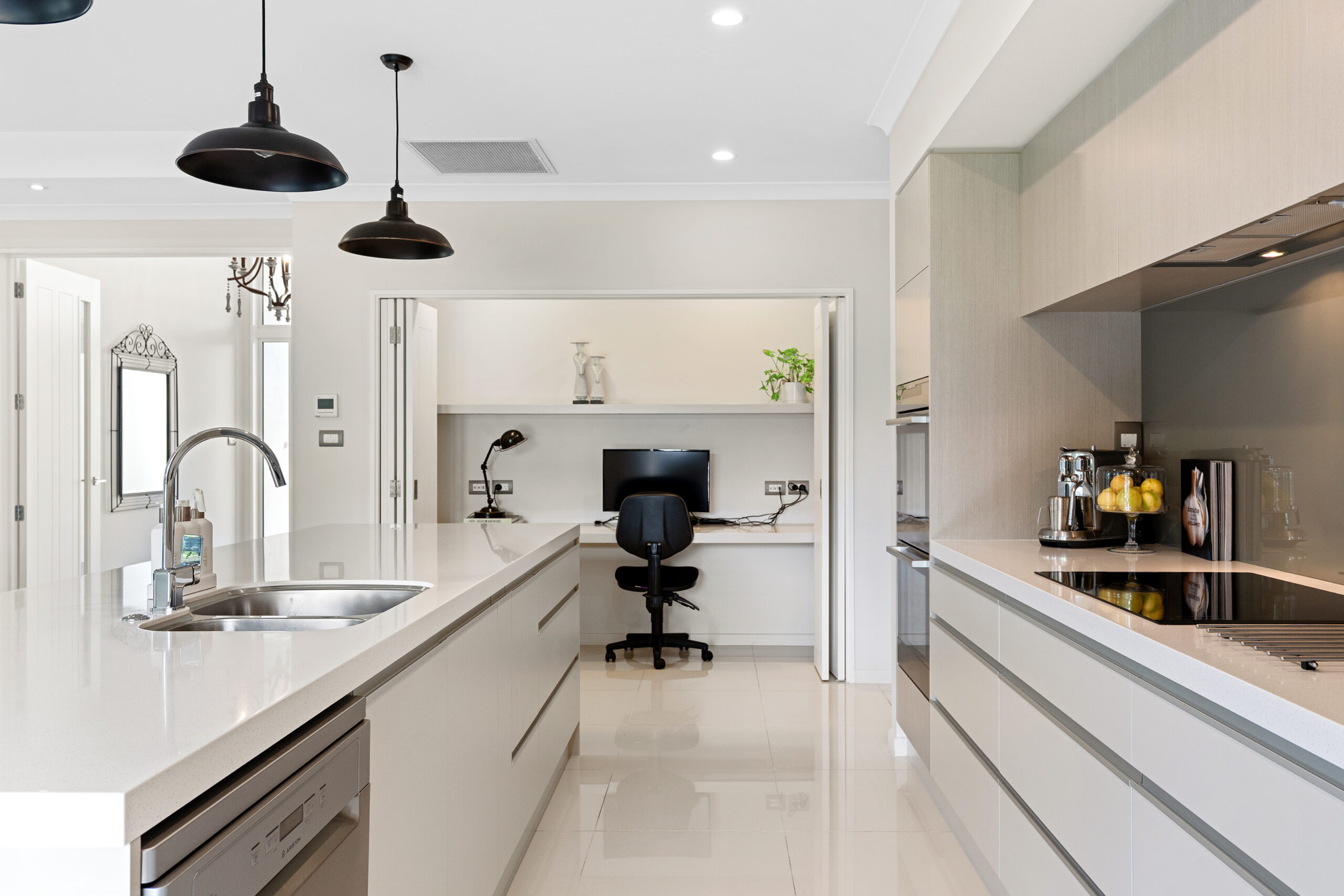 An open-plan living layout drives the design, centred on a well-appointed kitchen with double ovens, a substantial stone-topped island and a butler’s pantry, with a concealed study nook, dining space and lounge completing a configuration that covers every base in one space.