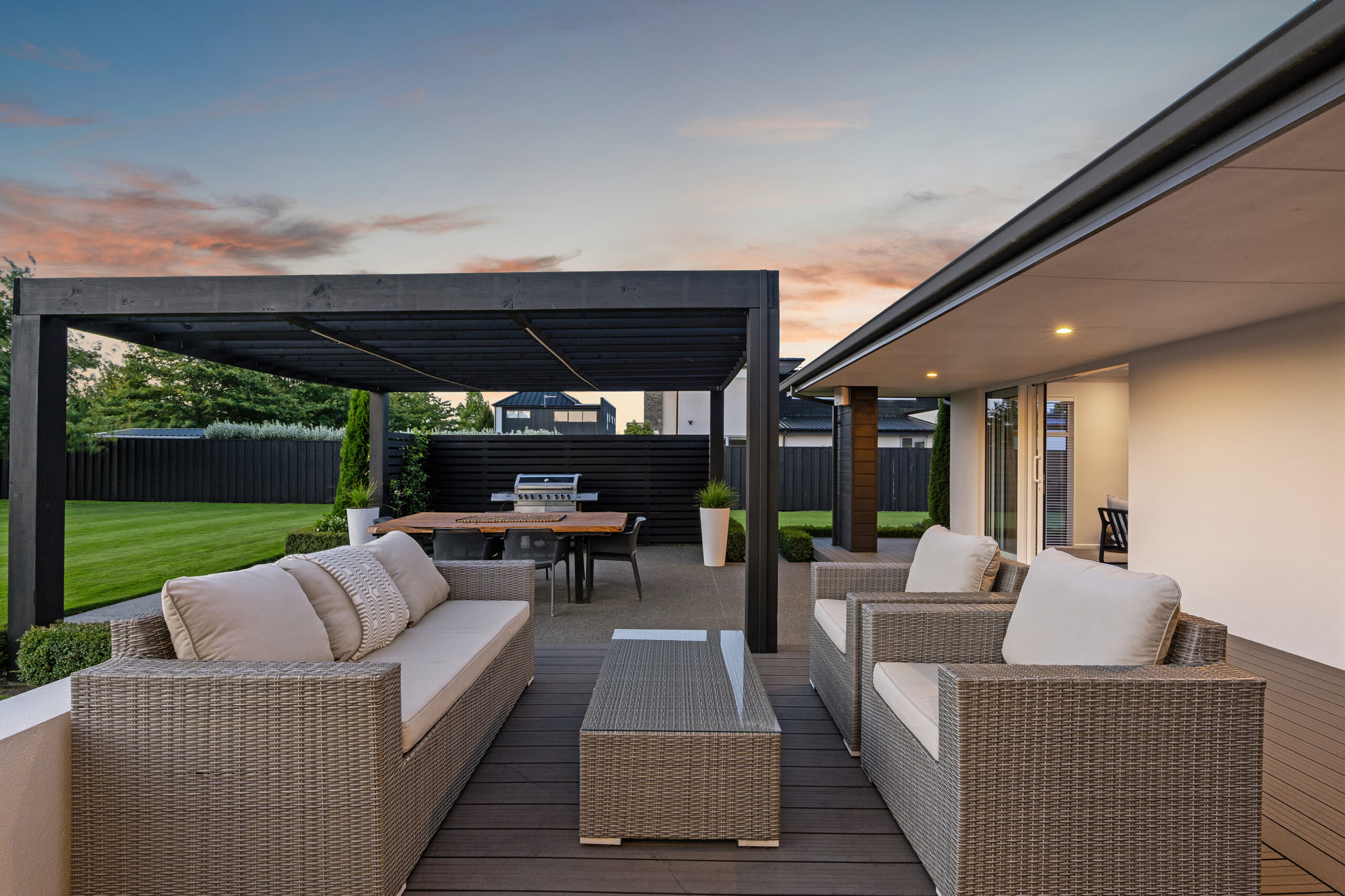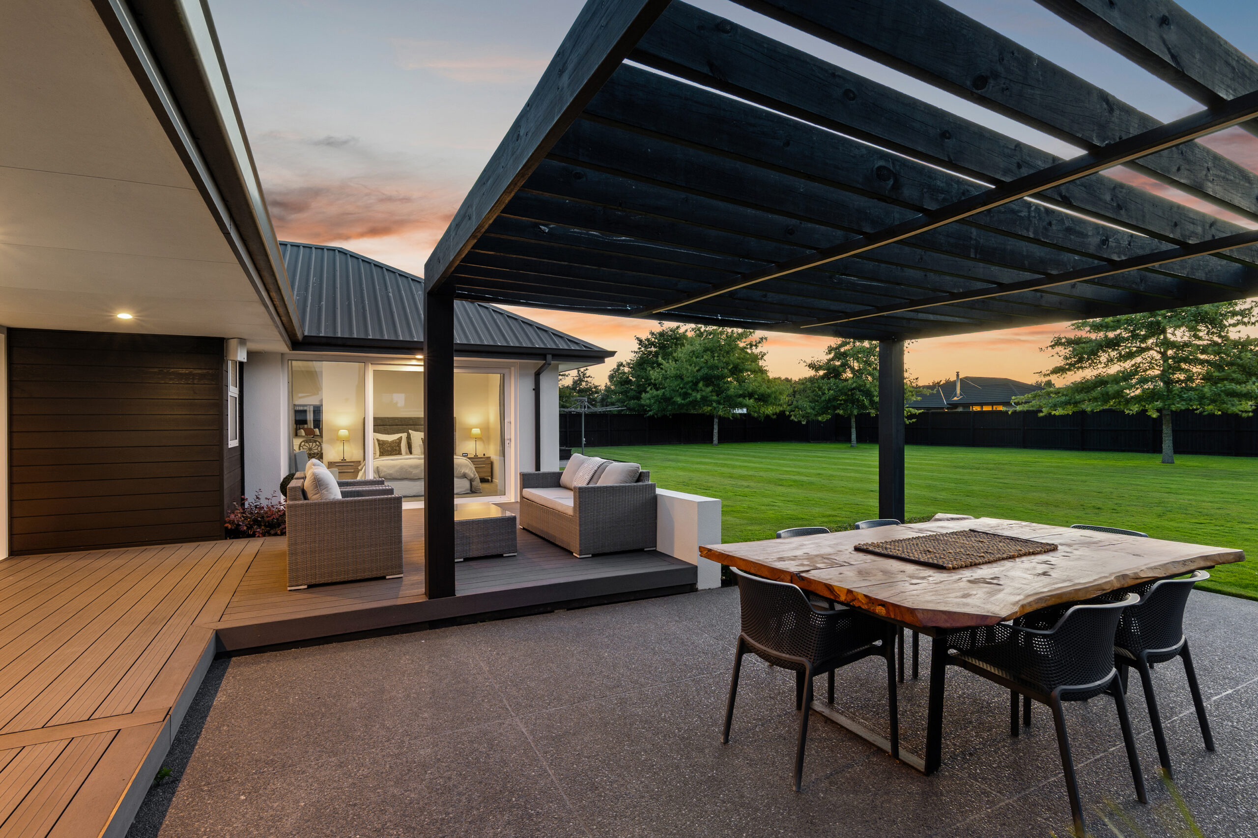 Sliding doors pull the open-plan space out to a terrace and deck, with a statement pergola adding structure and shade, while the sweeping lawn highlights the freedom of a 2,075sqm section.