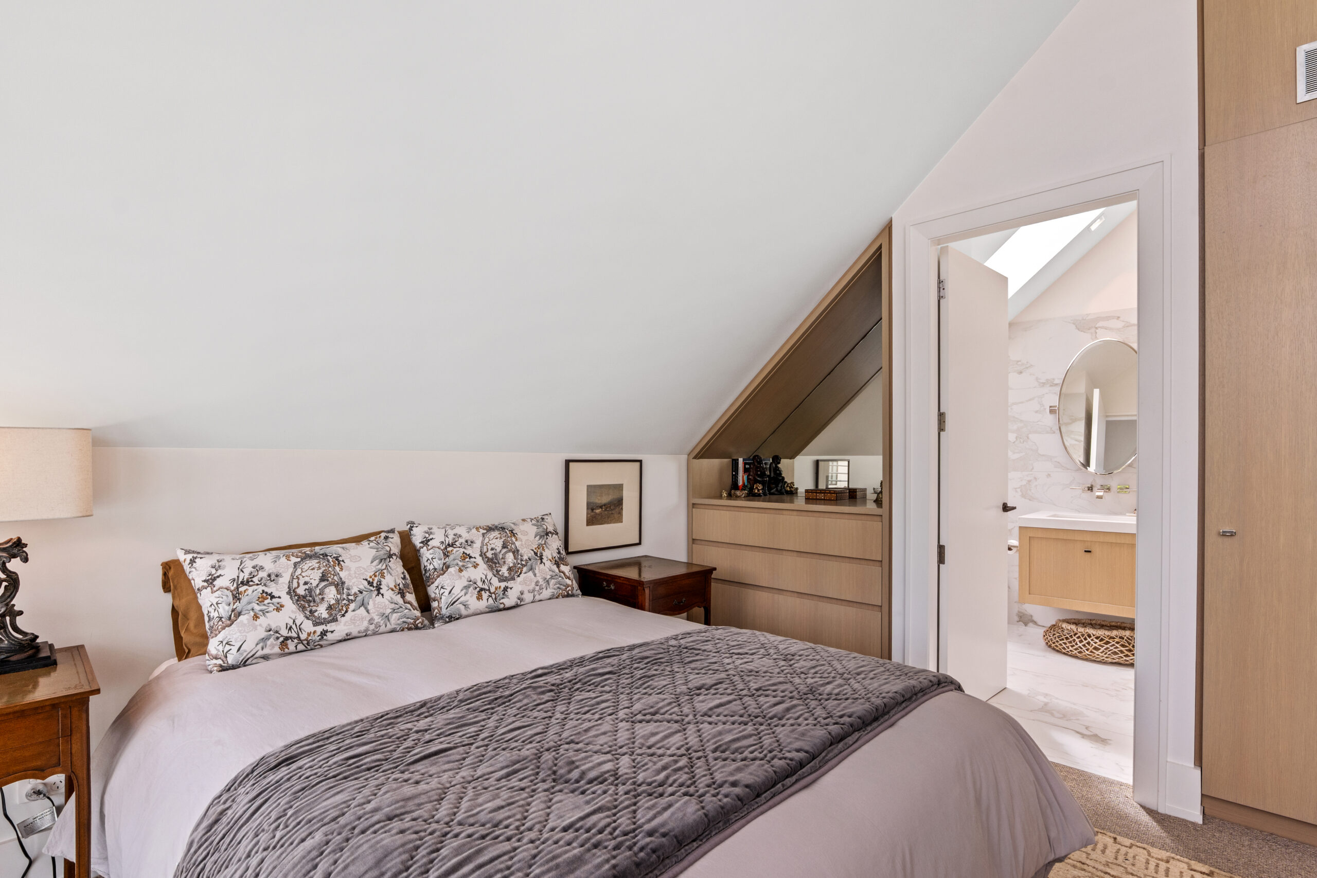 Adjacent is a library space or home office. The upper level has a soaring 5m pitched ceiling running through both master and second bedrooms. At each end of the pitch are full-height shuttered windows.