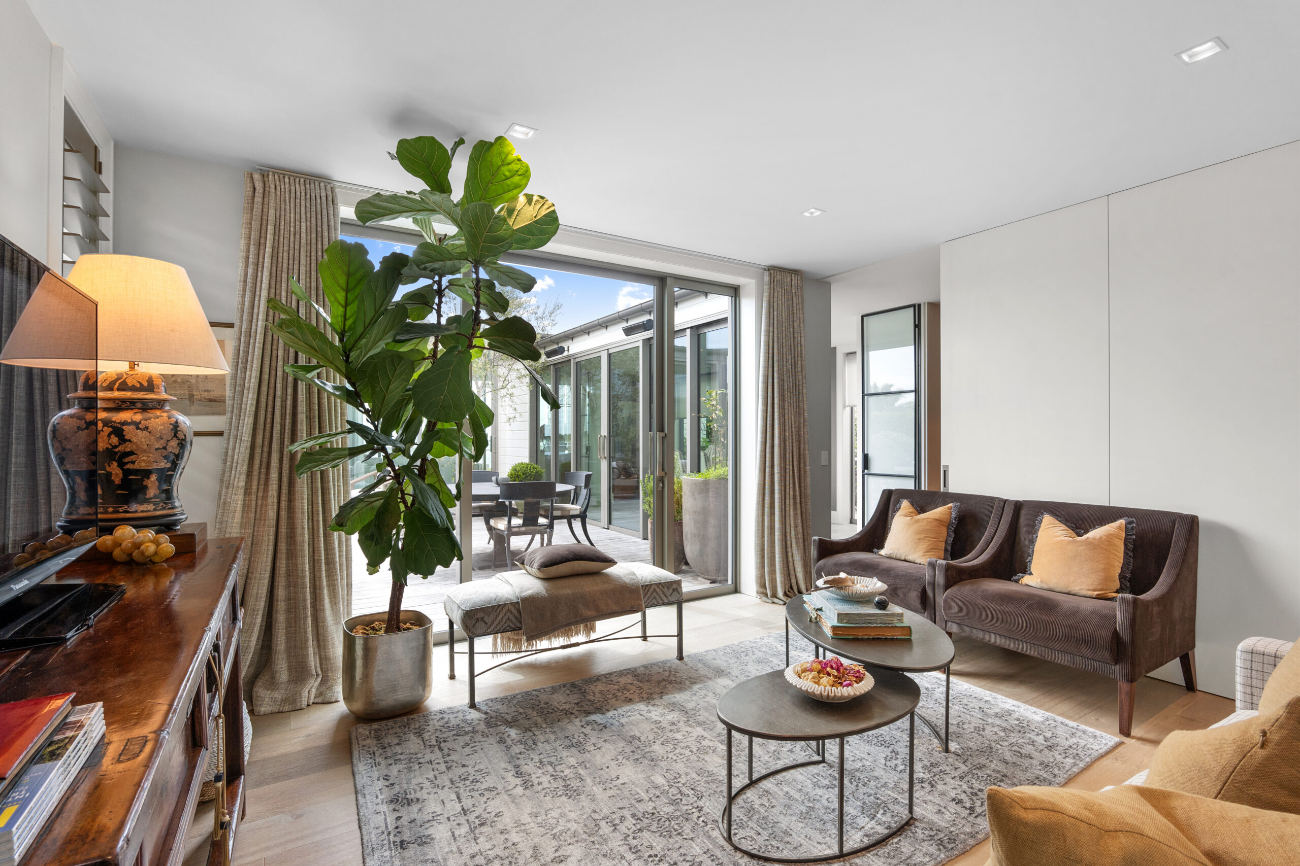 Large format wooden shutters frame the upstairs bedrooms quietly reinforcing the home’s American aesthetic. Detailed in warm oak and marble with quality appliances, the kitchen forms the centrepiece of daily life where full-height glazing draws the water into view.