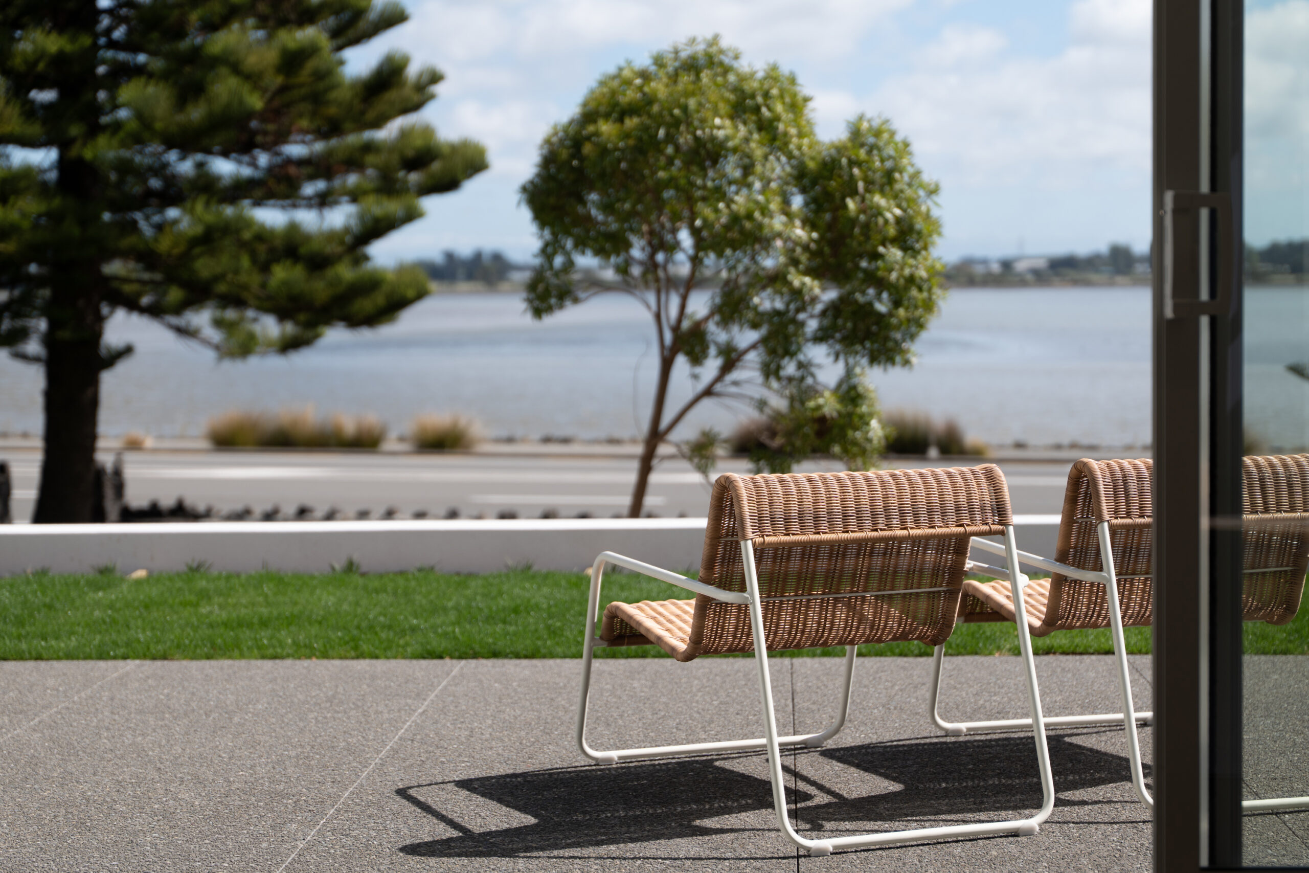 Upstairs is devoted to accommodation. Three generous double bedrooms include a master suite positioned to capture the full sweep of the outlook, complete with a walk-through wardrobe, elegant en-suite and floor-to-ceiling glazing aligned to the water’s edge.