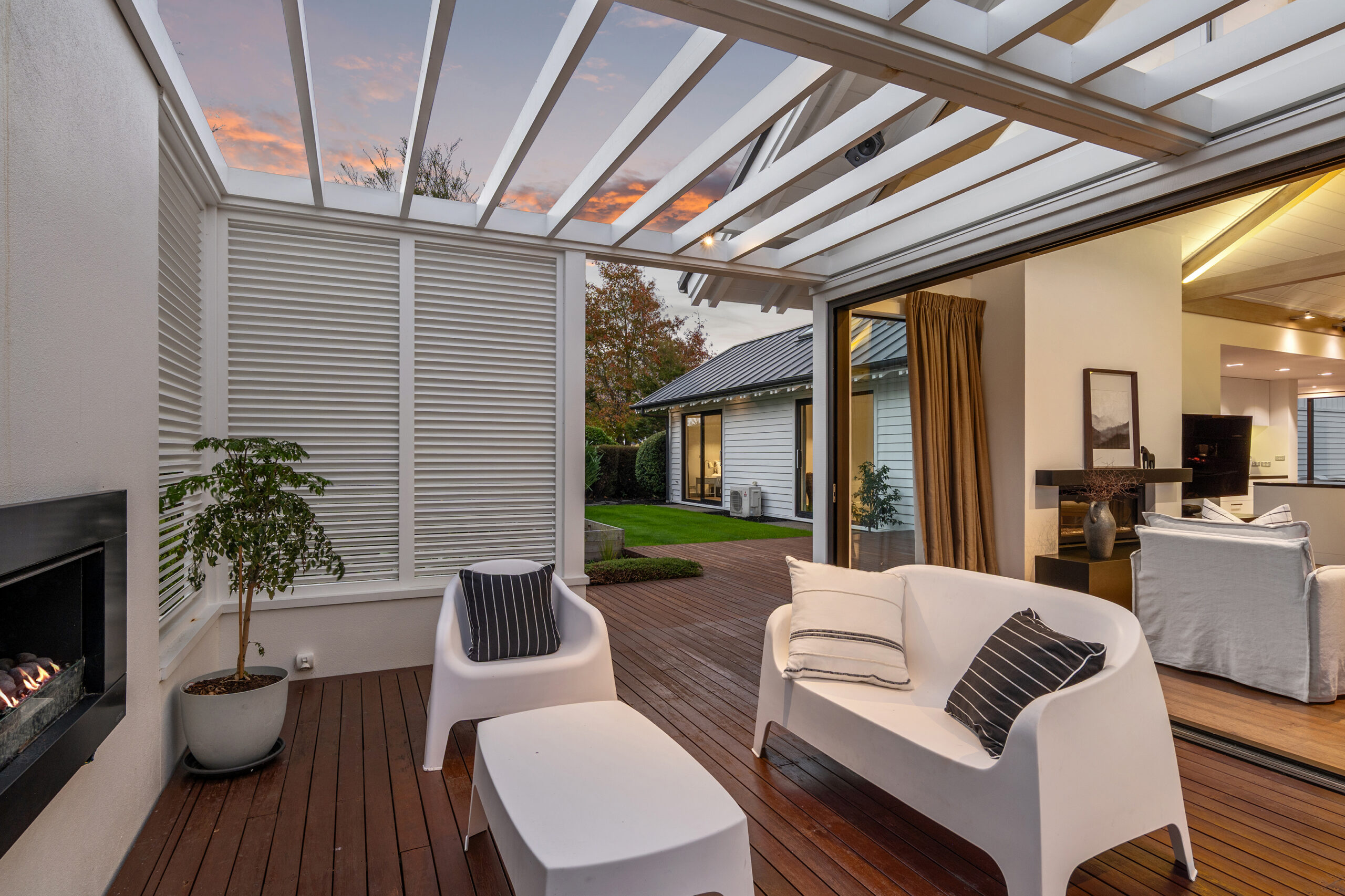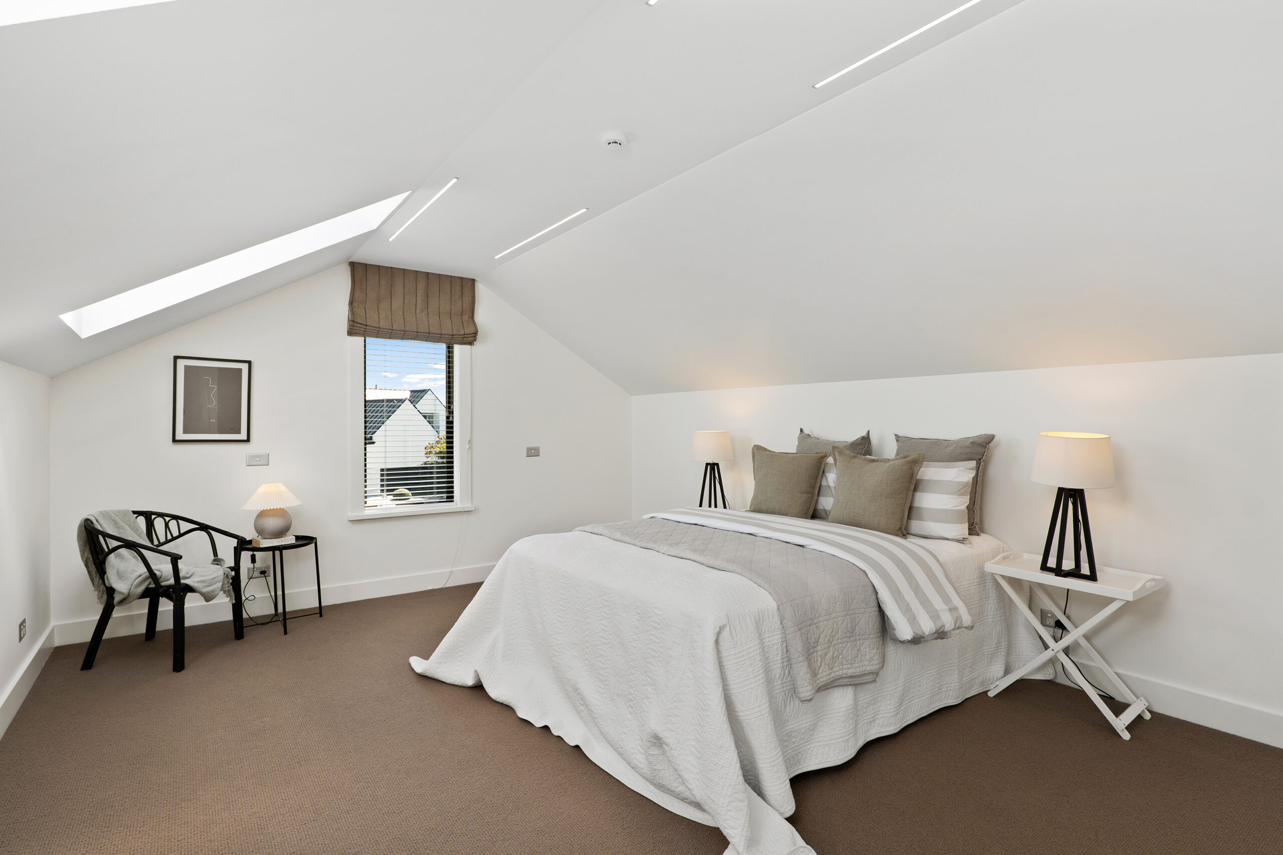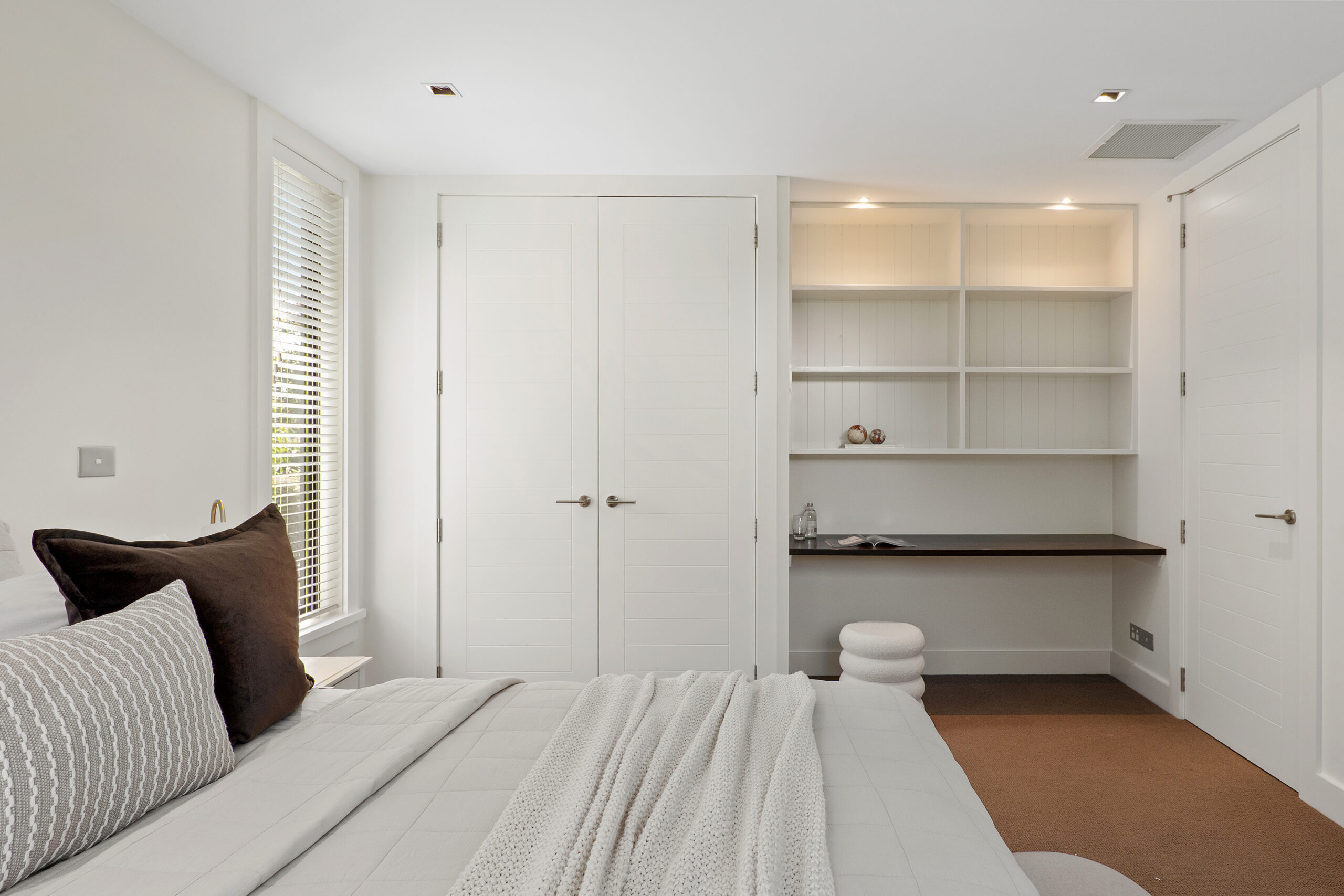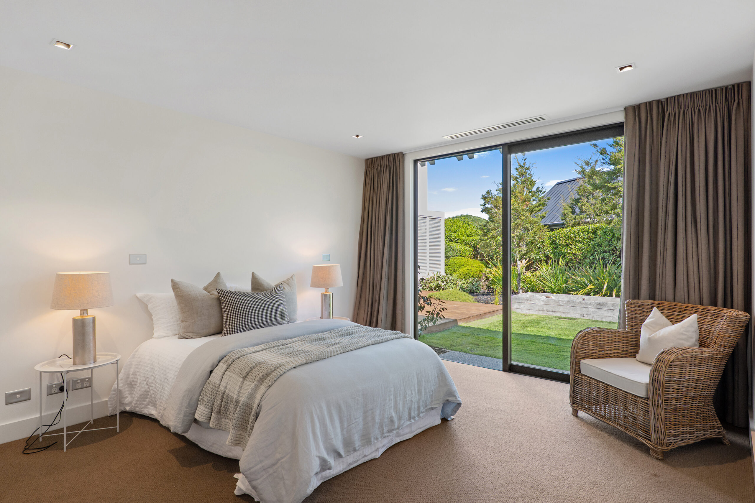 The accommodation continues the seamless outdoor engagement, beginning with a master suite featuring large sliding windows, a walk-in robe, and a deluxe ensuite with a bath, while two further double bedrooms open directly to the west-facing garden and share a tiled family bathroom.