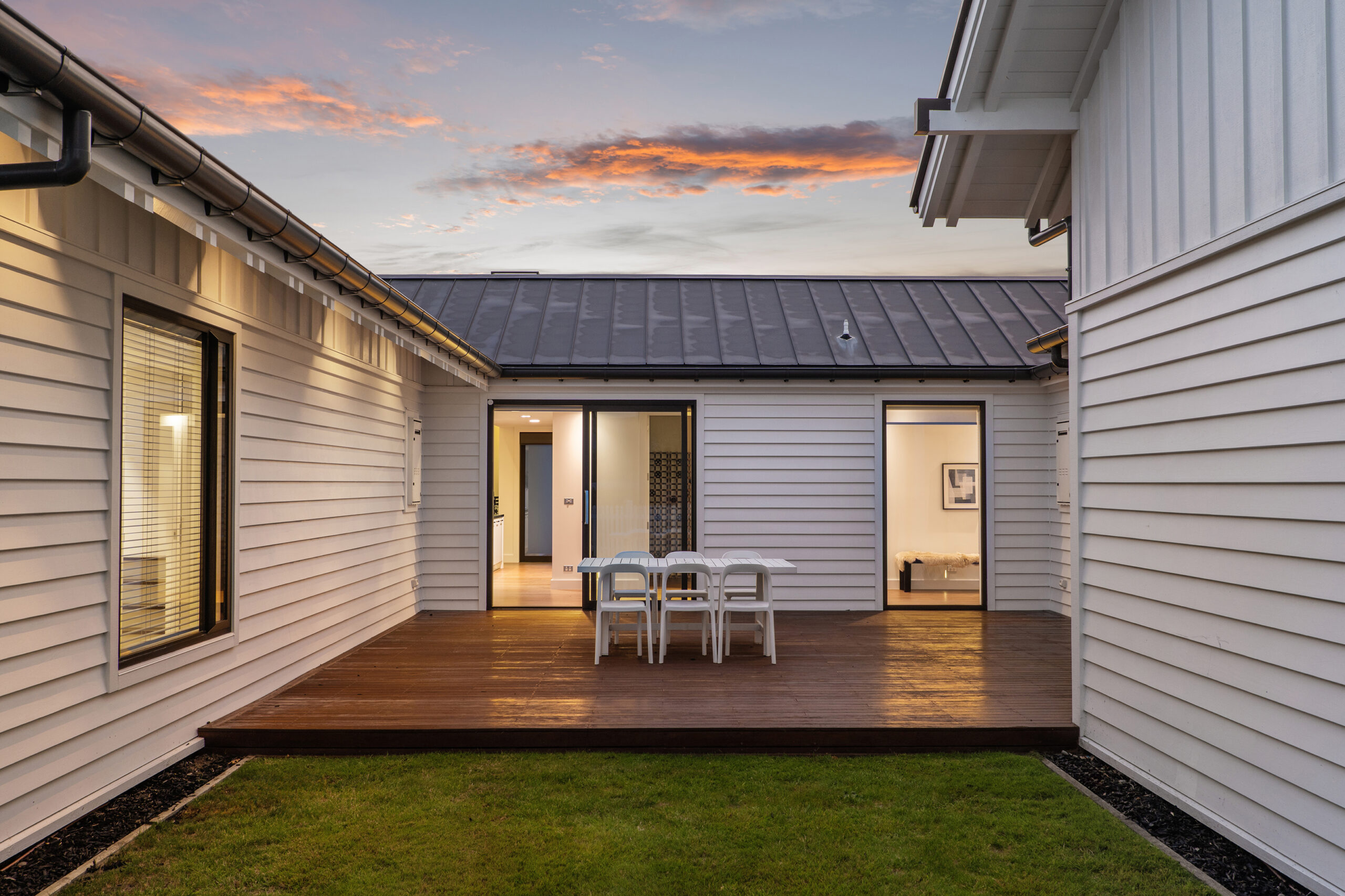 With a Hamptons-inspired aesthetic, the open-plan living and dining area takes centre stage beneath a pitched ceiling, where a gas fire and built-in cabinetry reinforce the clean-lined structure and refined finish.