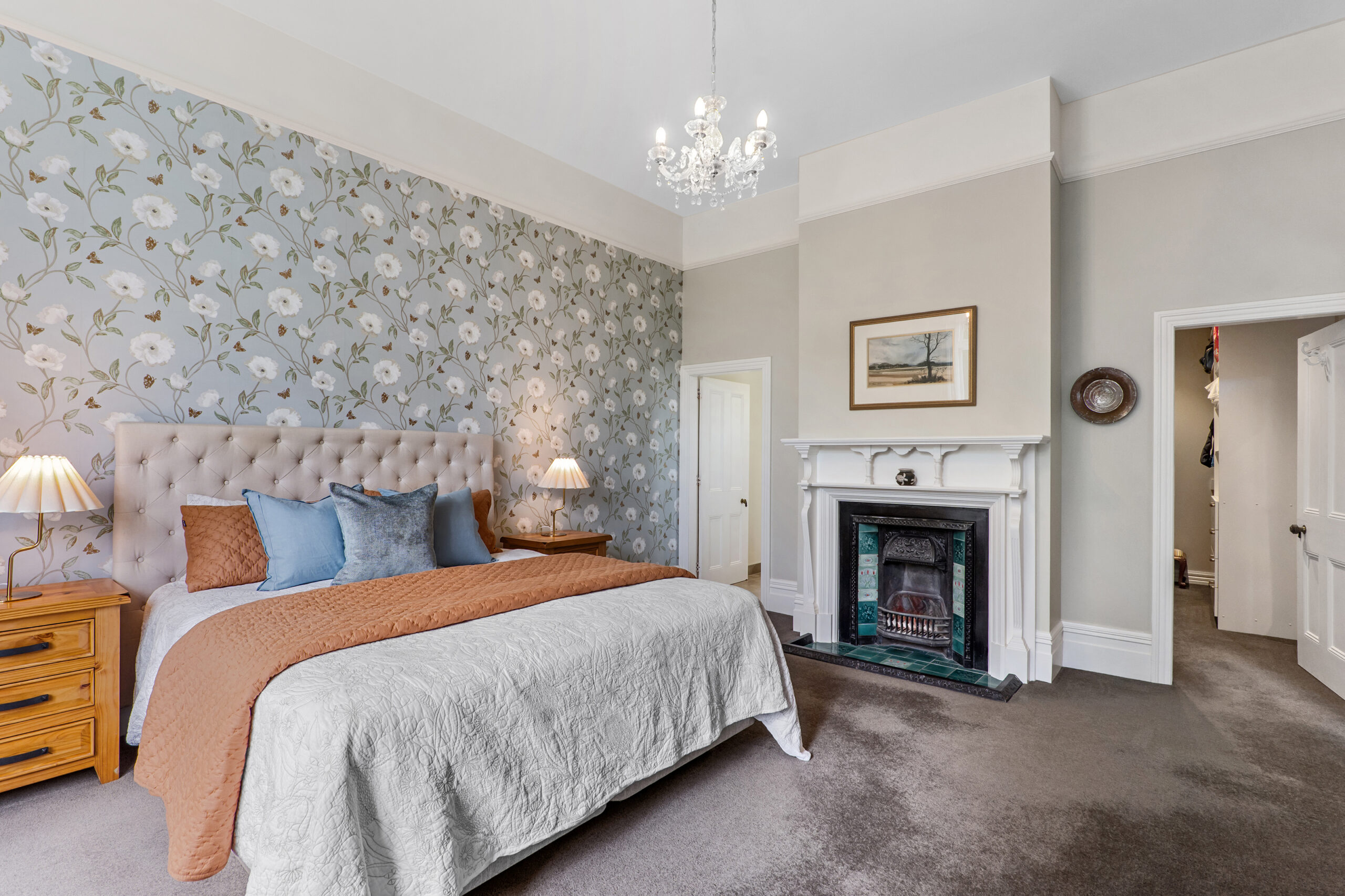 Four bedrooms and two neatly appointed bathrooms form the accommodation, supported by a separate laundry. The master suite carries the hallmark proportions of the era, with an ornate fireplace, a large bay window, a walk-in robe and en-suite, while each additional bedroom has its own distinction, from garden access to skylights and generous storage.
