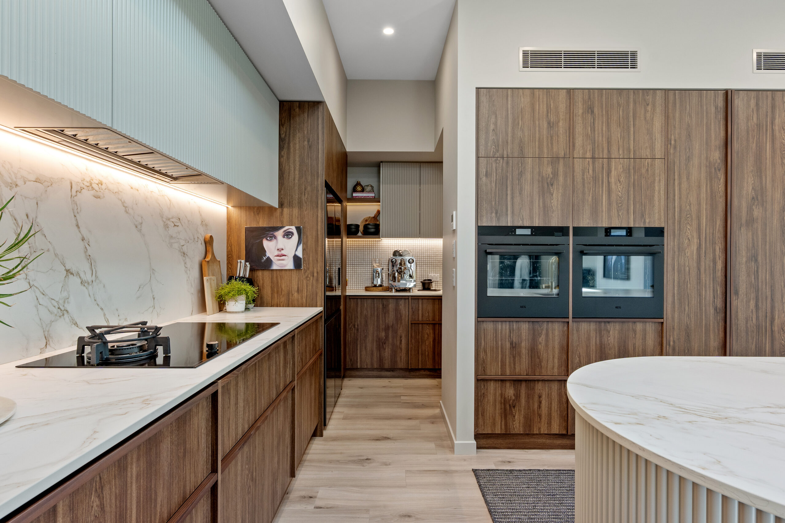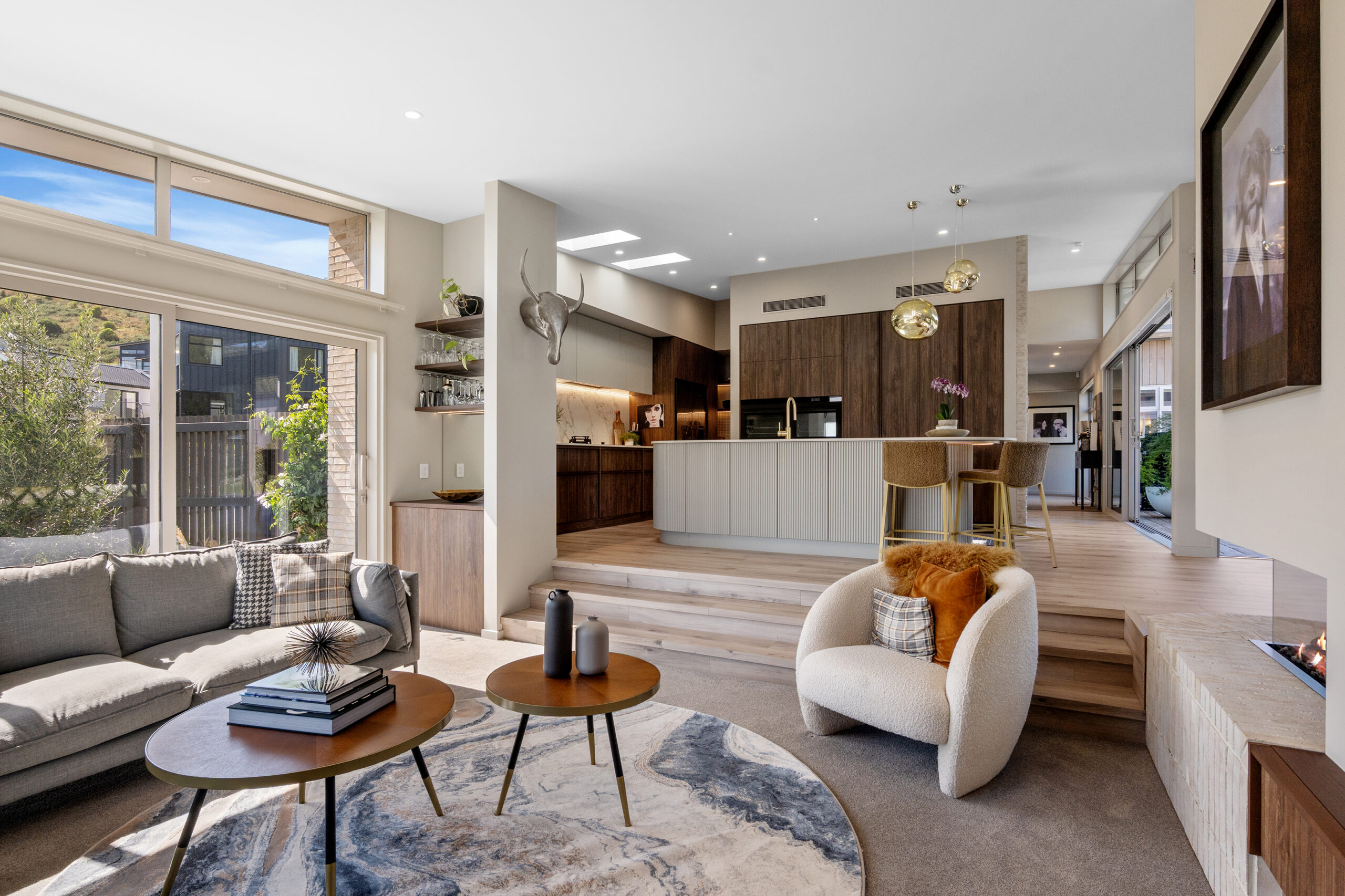 The leading living space sets the tone for style and scale, with the kitchen echoing the architecture with a curved porcelain island and a supporting scullery to extend the space. The dining area and sunken lounge provide defined spaces within the open-plan layout, subtly divided by a three-sided fireplace that becomes the natural focal point.