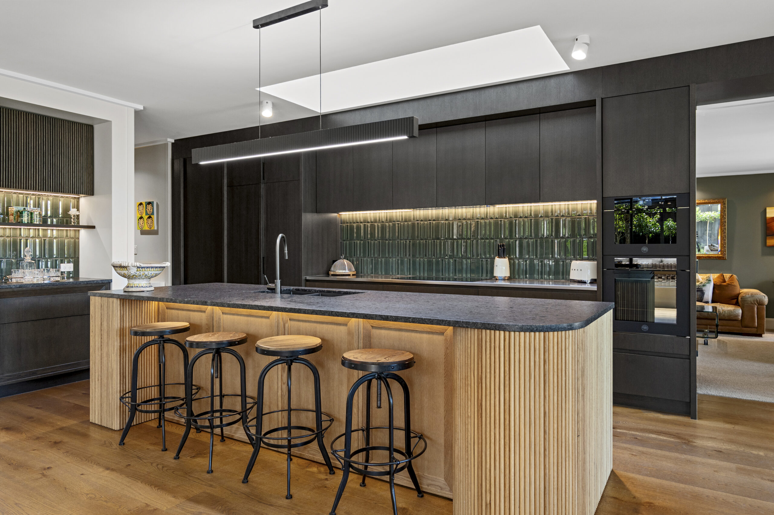 Open-plan living gathers around a statement kitchen, where the curved island’s fluted form is sharpened by shaker-style detailing and the support of a scullery, while the centrally positioned dining area is framed by window seating, completing a setting that masters the balance of timeless craft and contemporary execution.