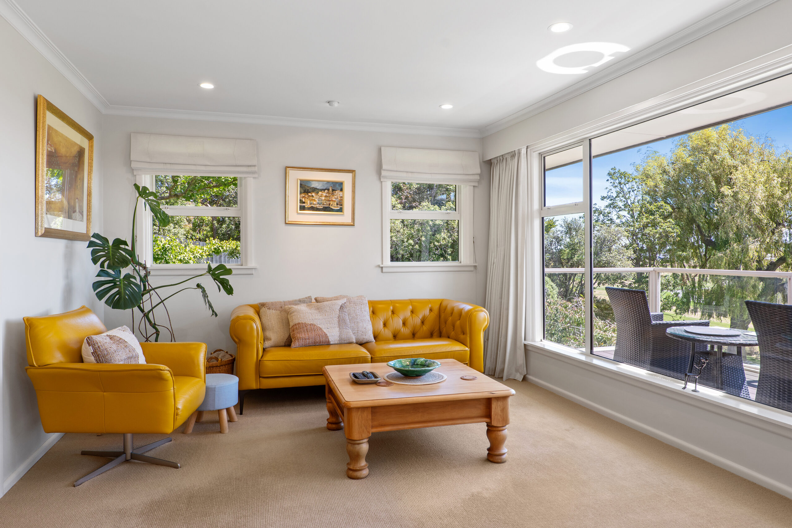 Miele appliances and scullery support give the kitchen its entertaining edge within the open-plan living room, where dining and casual sitting gather around a striking schist fireplace. In contrast, the adjoining formal lounge turns its attention to the stream, offering a relaxing counterpoint to the home’s social centre.