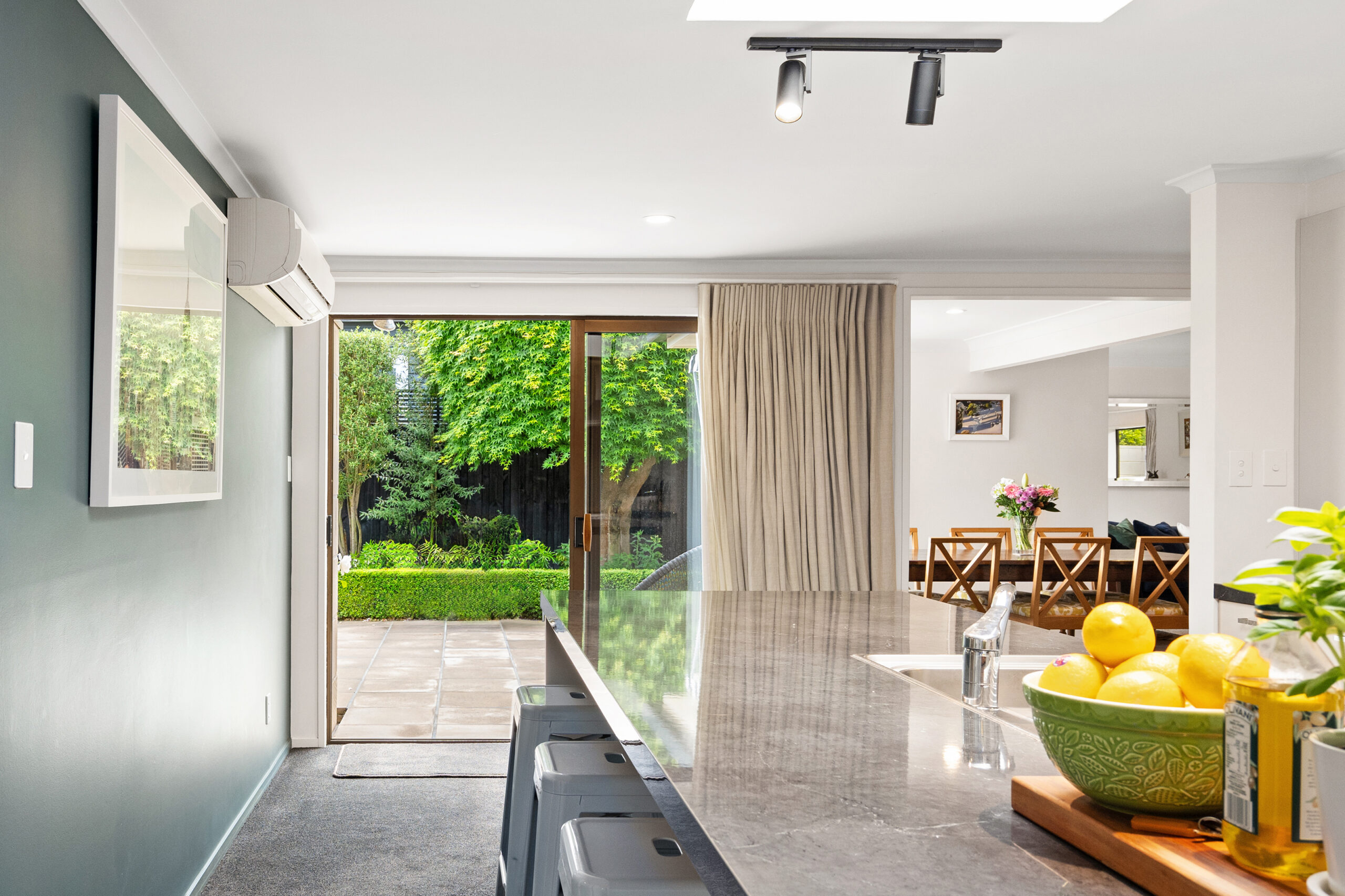 A sizeable skylight draws the eye to the modern kitchen, before a generous open-plan layout carries from dining occasions to fireside evenings in the lounge. Sliding doors extend the living spaces into an expansive north-west-facing courtyard where established landscaping gives outdoor entertaining privacy, presence and the full advantage of the afternoon sunshine.