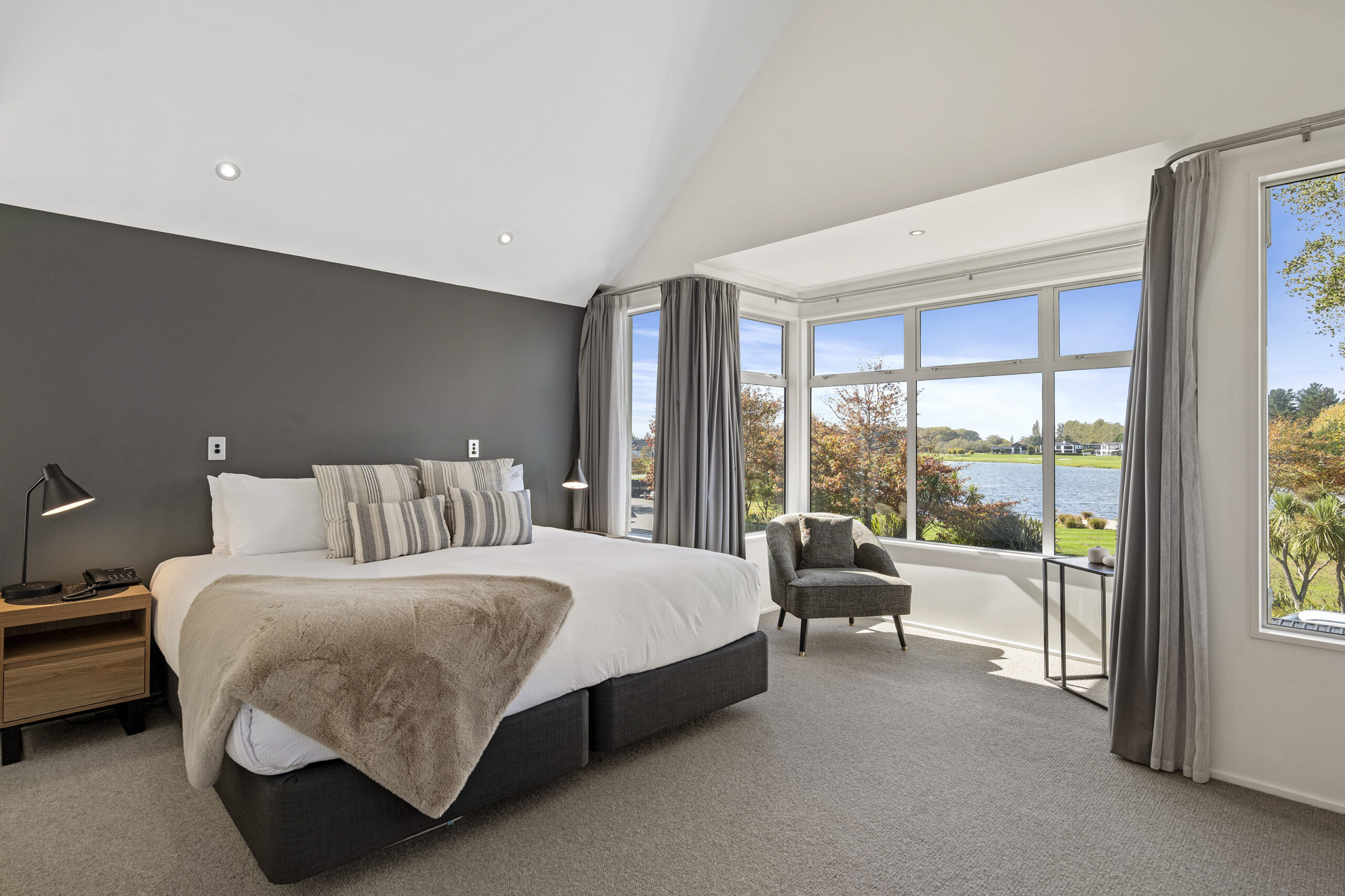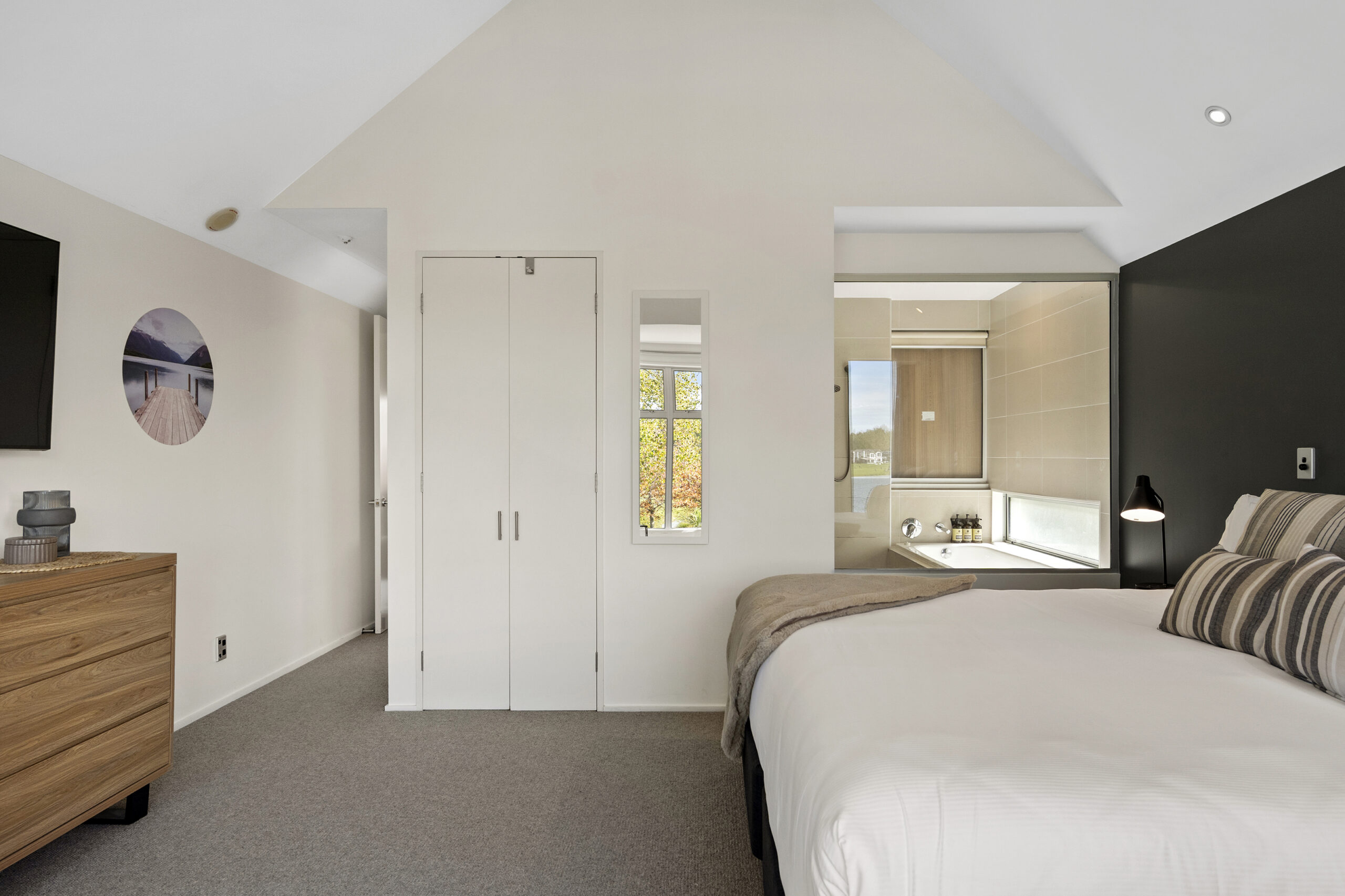 In the bedroom, a bay window brings the best of the lake into view, adjoined by a fully tiled bathroom pairing a separate shower with a soaking tub.